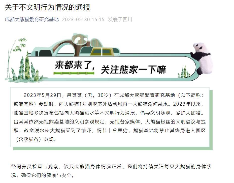 荔枝新闻讯 据“成都大熊猫繁育研究基地微信公号”消息,2023年5月29日,吕某某(男,30岁)在成都大熊猫繁育研究基地(以下简称:熊猫基地)参观时,向大熊猫1号别墅室外活动场内一大熊猫泼矿泉水。2023年以来,熊猫基地多次发布包括向大熊猫泼水等不文明行为通报,倡导文明参观、爱护大熊猫。吕某某依然无视熊猫基地的文明参观规定,无视各家媒体、大熊猫粉丝的文明倡议与提醒,故意泼水使大熊猫受到了惊吓,情节十分恶劣,熊猫基地将禁止其终身进入园区(含熊猫谷)参观。