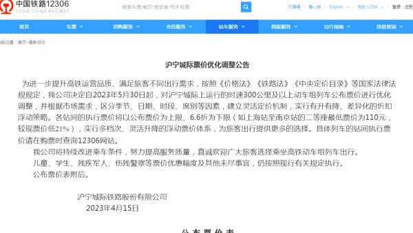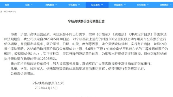 从今天(5月30日)开始,沪宁、宁杭等多条高铁实行浮动票价。上限为公布票价,下限为公布票价的6.6折。
