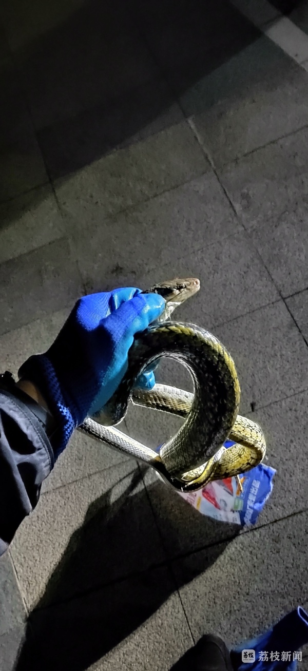 南京江北新区的辅警在下班时发现了一条菜花蛇,为防止它伤害过路市民,辅警徒手抓蛇。今天(5月30日),南京江北新区警方通报了当时的情况,也提醒大家注意。