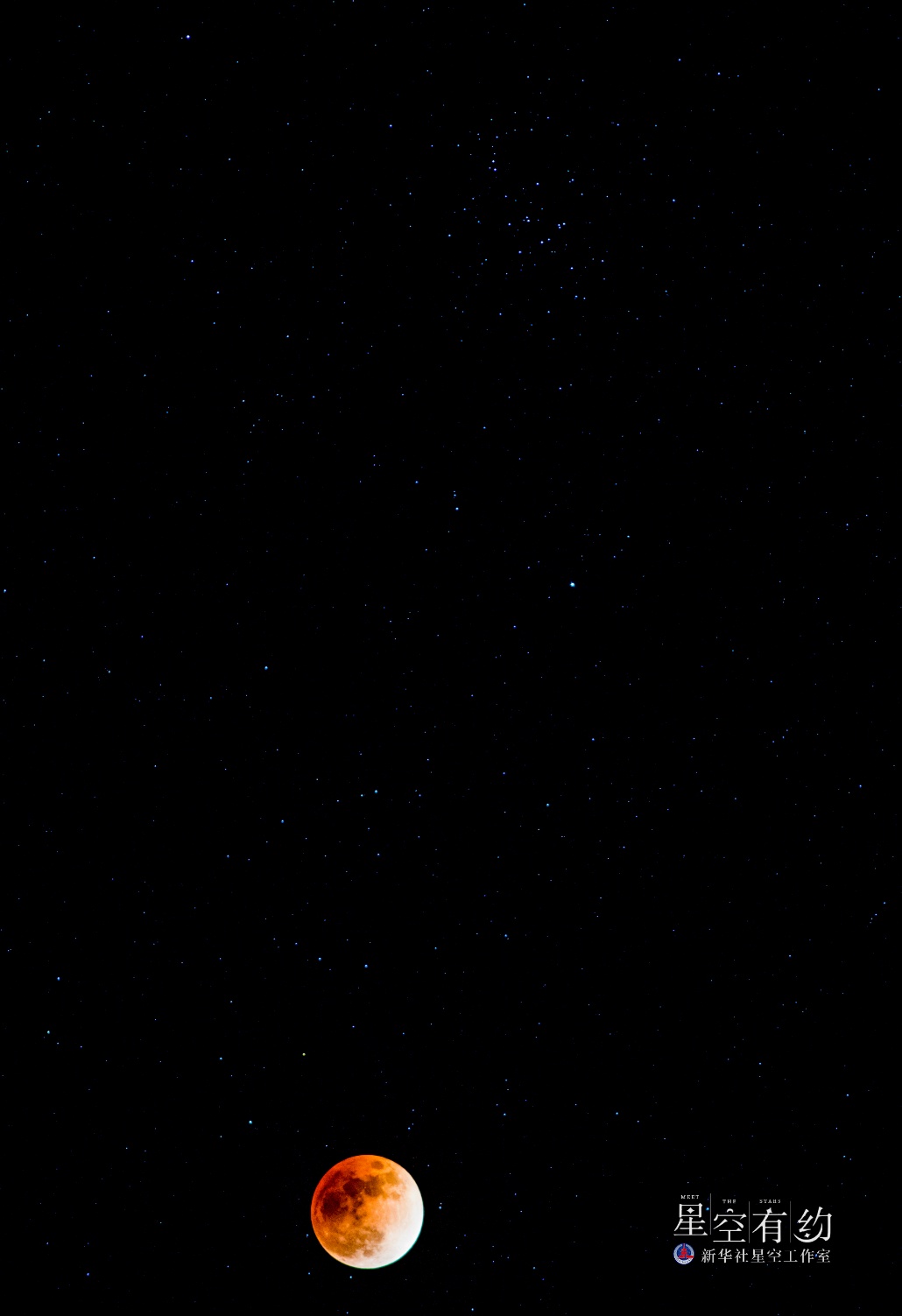 北京市天文摄影爱好者杨勇2018年2月3日在黑龙江省漠河市北红村拍摄的月食与蜂巢星团。(本人供图)