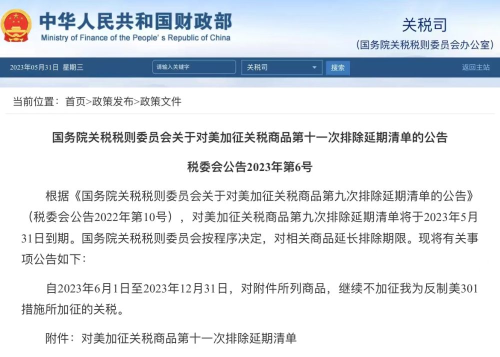 记者5月31日从国务院关税税则委员会办公室了解到,经国务院批准,国务院关税税则委员会公布对美加征关税商品第十一次排除延期清单,对《国务院关税税则委员会关于对美加征关税商品第九次排除延期清单的公告》(税委会公告2022年第10号)中的相关商品,延长排除期限,自2023年6月1日至12月31日,继续不加征我为反制美301措施所加征的关税。