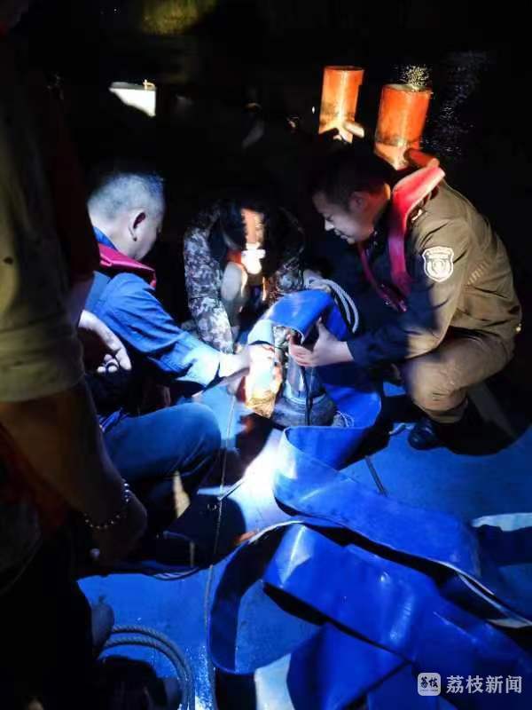 到达现场后,执法人员了解到,该船舶前舱在行驶至高港船闸附近时被江边抛石划破,虽然此时船舶已经抢滩成功,但当时正处于涨潮期,水位仍在快速上涨,一旦江水漫入机舱,将给船民造成巨大损失,船民心急如焚。执法人员当机立断,协调高港船闸和附近商户送来2台大功率抽水泵,利用执法艇上的发电机接电对船舶漏水前舱进行抽水,同时,联系专业水下作业人员对船舶进行修补。凌晨0点40分,当3台大功率抽水泵开始工作后,船舶前舱水位得到控制,至凌晨4时,水下作业人员对船舶前舱右舷两个直径20厘米的洞修补完毕后,船舶完全脱险,并于当天清晨自行过闸离开。