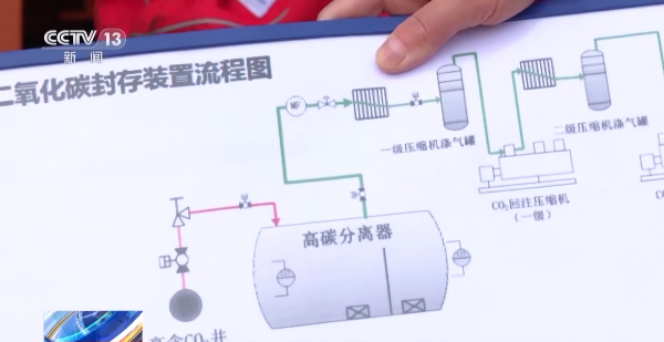 这张图是“二氧化碳封存装置”的流程图。首先,油井开采产生的油气混合液进入“高碳分离器”,把二氧化碳分离出来;再进入我身后这样的“压缩机”,进行加压和干燥,让它变成介于气体和液体之间的超临界状态;最后,就能通过“回注井”封存到位于800米深的海底地层了。而这样的整个过程只需要20分钟左右。