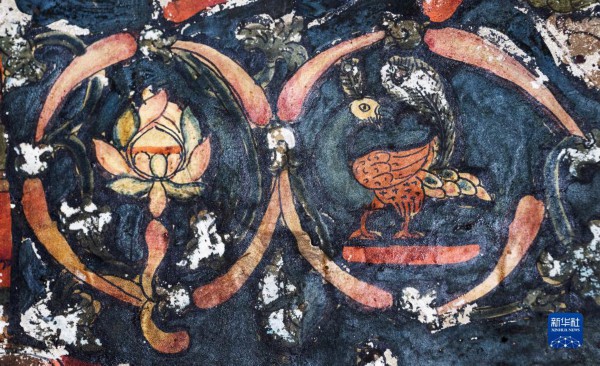 这是5月26日拍摄的皮央石窟壁画中的孔雀像。新华社记者 费茂华 摄