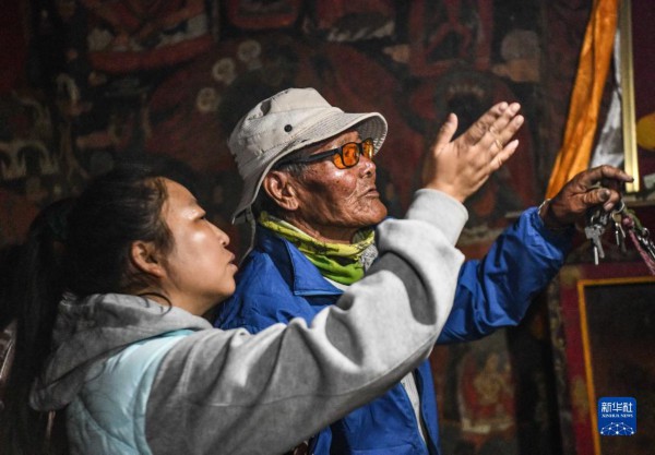 皮央和东嘎石窟遗址文保员仁增旺扎老人给游客讲解壁画(5月26日摄)。新华社记者 晋美多吉 摄