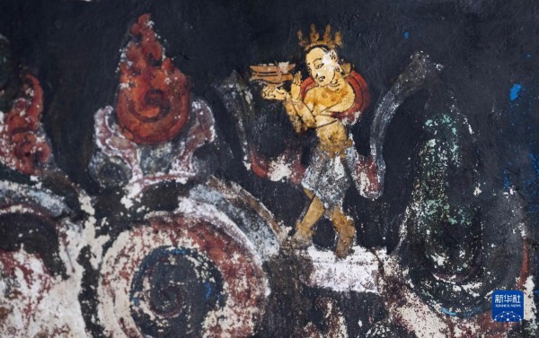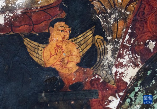 这是5月26日拍摄的皮央石窟壁画中的长翅膀的人物造型。新华社记者 费茂华 摄