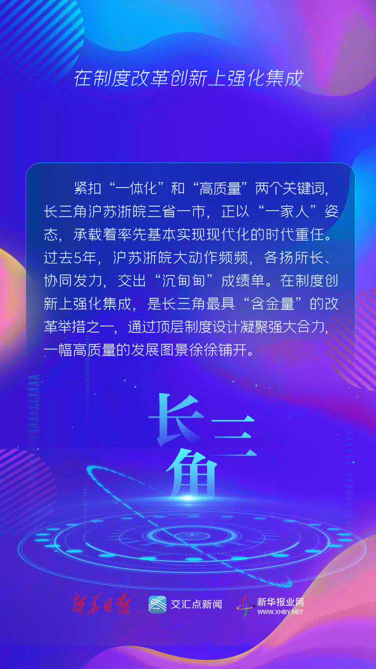 这是一片高质量发展的热土——以4%的国土面积,创造了全国约1/4的经济总量。作为中国经济版图中经济最活跃、开放程度最高、创新能力最强的区域之一,长三角地区在国家现代化建设大局和全方位开放格局中具有举足轻重的战略地位。自2018年上升为国家战略以来,5年间,沪苏浙皖三省一市聚焦重点领域协同推进、重点区域率先突破、重大项目强化落实、重大平台深化合作,加快迈向更高质量一体化发展,取得积极进展和成效!