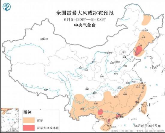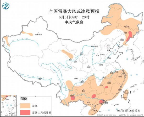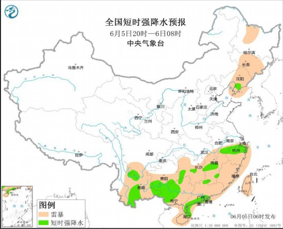 预计6月5日08时至6日08时,安徽东南部、湖北西南部、湖南南部、江西、浙江中北部、四川南部、贵州南部、云南中东部、广西、广东西南部、海南岛西部、台湾岛中部等地的部分地区将有短时强降水天气,小时雨量20-50毫米,局地可达60毫米以上;另外,吉林东部、辽宁南部、江西中部、云南东南部、广西西部和东北部、广东西南部等地的局地将有雷暴大风或冰雹天气。