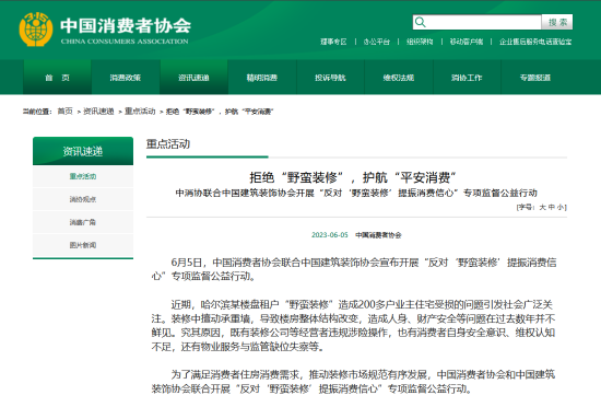 为了满足消费者住房消费需求,推动装修市场规范有序发展,中国消费者协会和中国建筑装饰协会联合开展“反对“野蛮装修”提振消费信心”专项监督公益行动。