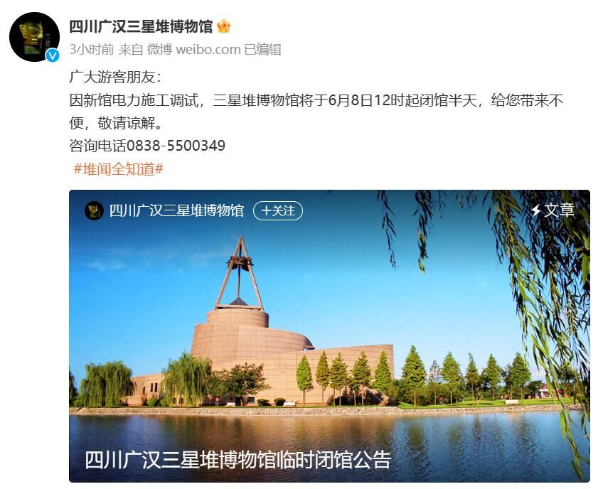 荔枝新闻讯 6月6日,@四川广汉三星堆博物馆 微博发布“四川广汉三星堆博物馆临时闭馆公告”,称因新馆电力施工调试,三星堆博物馆将于6月8日12时起闭馆半天,给您带来不便,敬请谅解。