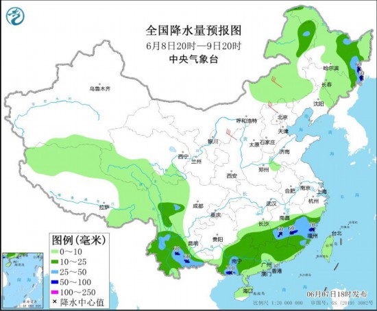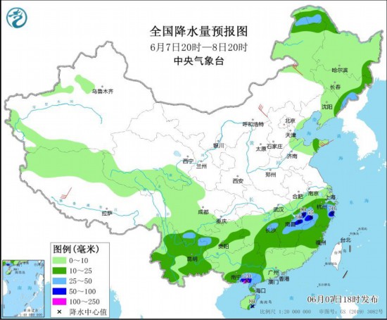 6月7日20时至8日20时,内蒙古东北部、黑龙江西北部、吉林东部、江南大部、西南地区南部、华南南部等地部分地区有中到大雨,其中,江西北部、浙江中部、广西东南部沿海等地部分地区有暴雨或大暴雨(100~120毫米)。内蒙古中部和东部、西藏南部、山东半岛等地部分地区有5~6级风(见图1)。