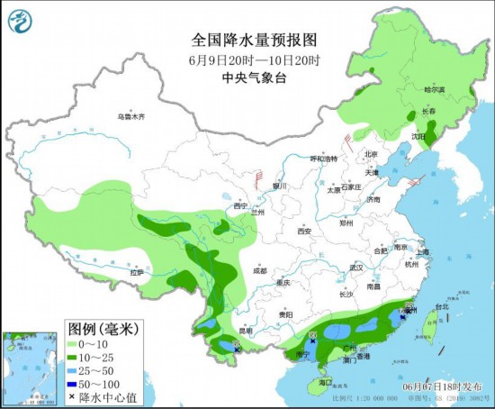 6月9日20时至10日20时,内蒙古东北部、辽宁东部、青海南部、西藏东部、四川东部、云南东南部、华南大部等地部分地区有中到大雨,其中,云南西南部、广西南部、福建东南部等地局地地区有暴雨(50~60毫米)。西北地区中部、华北北部、山东半岛等地部分地区有5~7级风(见图3)。