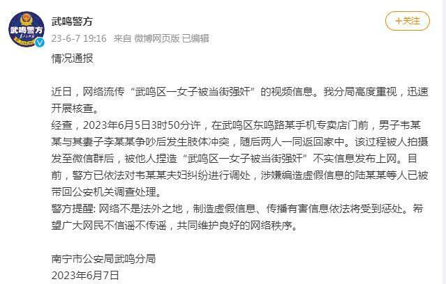 经查,2023年6月5日3时50分许,在武鸣区东鸣路某手机专卖店门前,男子韦某某与其妻子李某某争吵后发生肢体冲突,随后两人一同返回家中。该过程被人拍摄发至微信群后,被他人捏造“武鸣区一女子被当街强奸”不实信息发布上网。目前,警方已依法对韦某某夫妇纠纷进行调处,涉嫌编造虚假信息的陆某某等人已被带回公安机关调查处理。