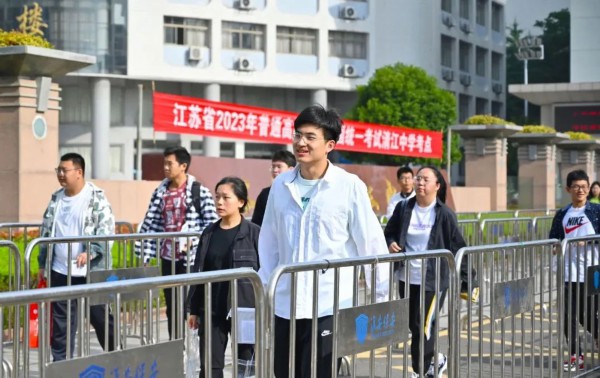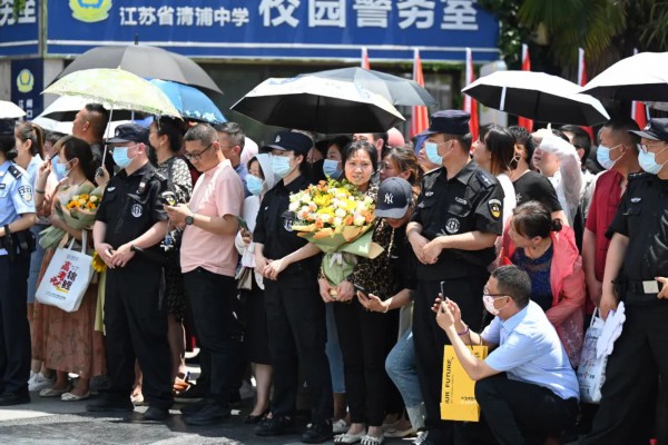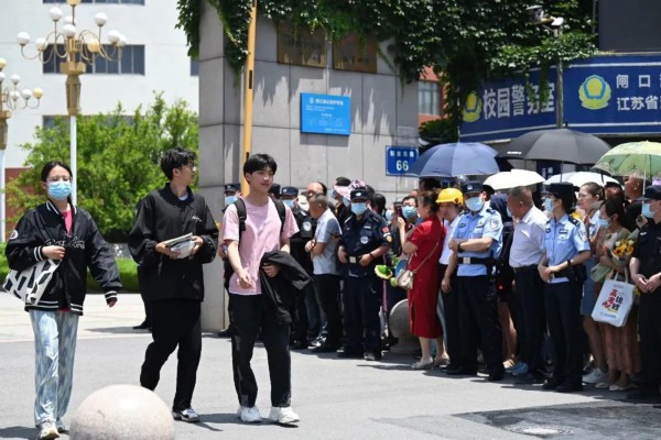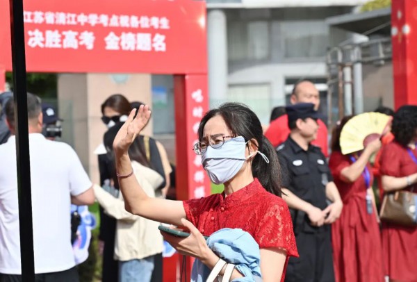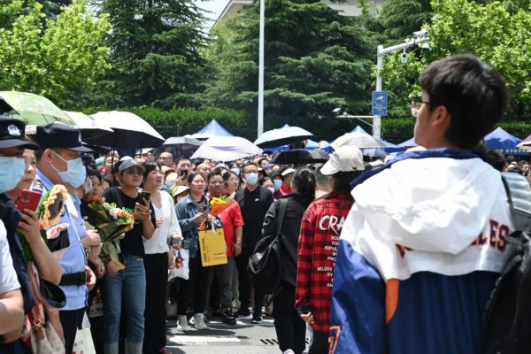 ▲江苏省清浦中学考点外,考生们结束考试后走出考场,家长们“夹道欢迎”