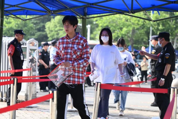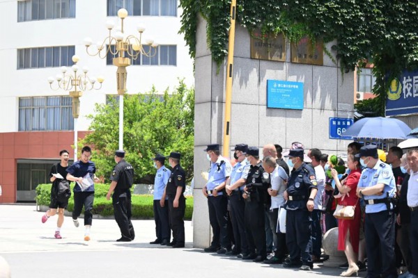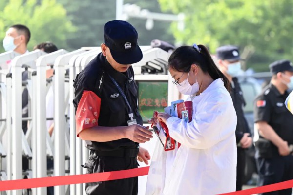 ▲江苏省清浦中学考点门口,安保人员正在检查考生的相关证件