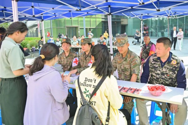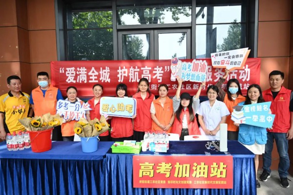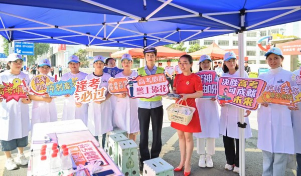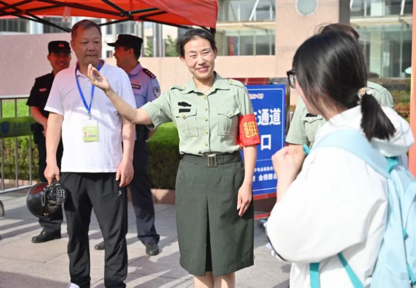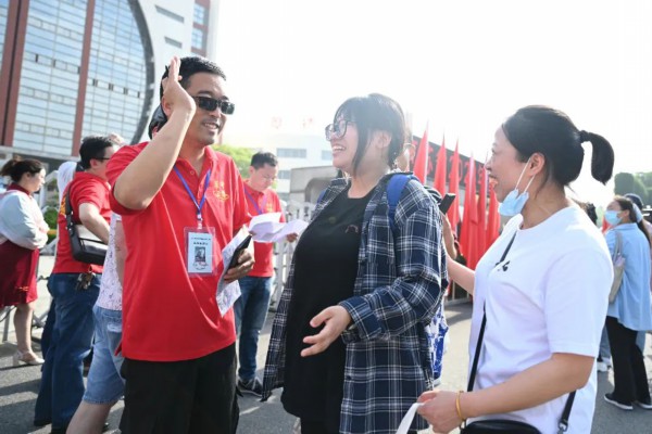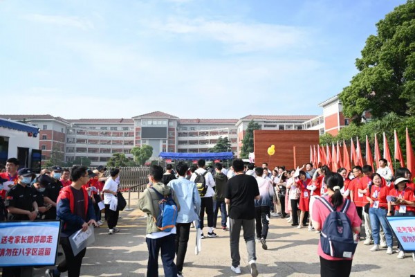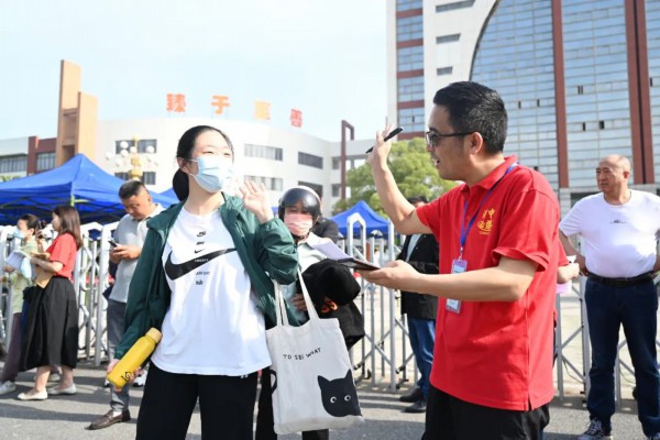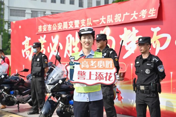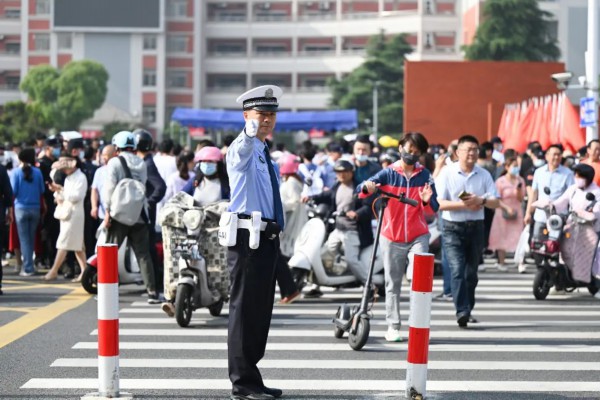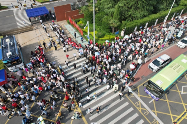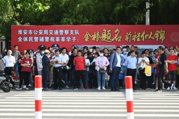 ▲江苏省清江中学考点附近,区退役军人事务局工作人员、市交警支队一大队民警、府前街道工农社区志愿者等为高考考生保驾护航