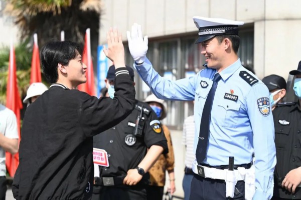 ▲江苏省清浦中学考点附近,在此执勤的市交警支队二大队交警与考生击掌,为其加油