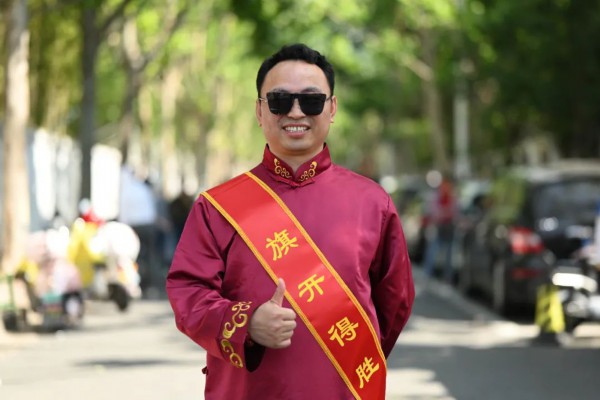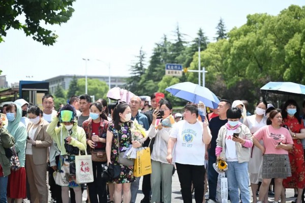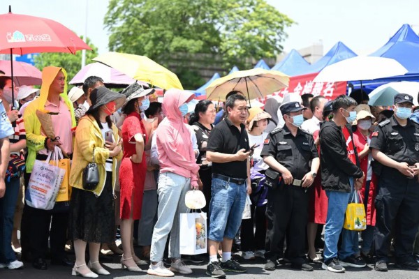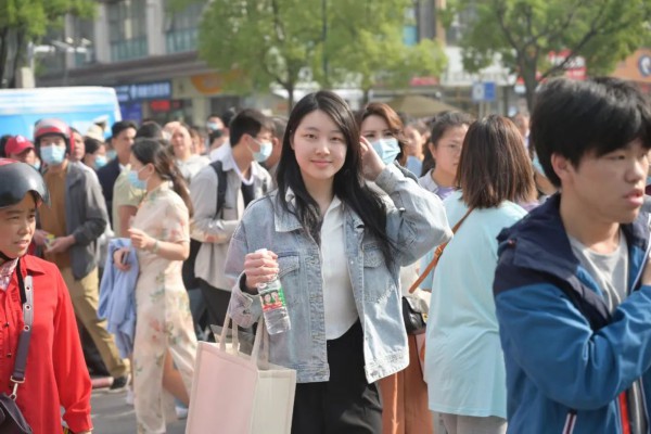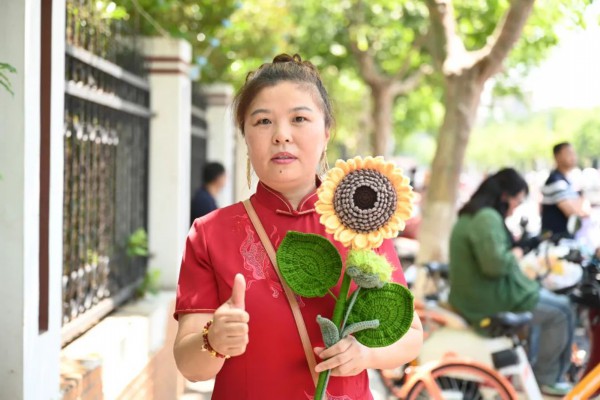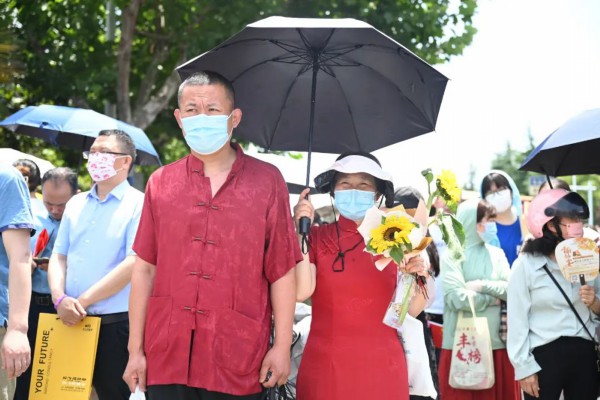 ▲不少家长穿着唐装、旗袍,拿着向日葵前来送考,寓意“旗开得胜”“一举夺魁”