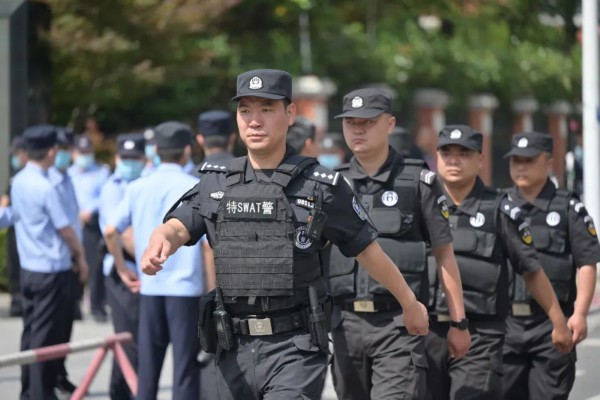 ▲江苏省清河中学考点附近,特警正在考场外巡逻