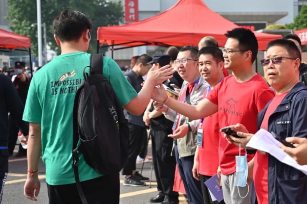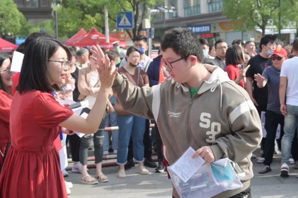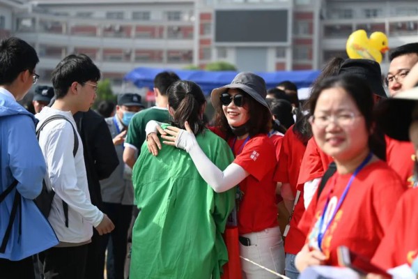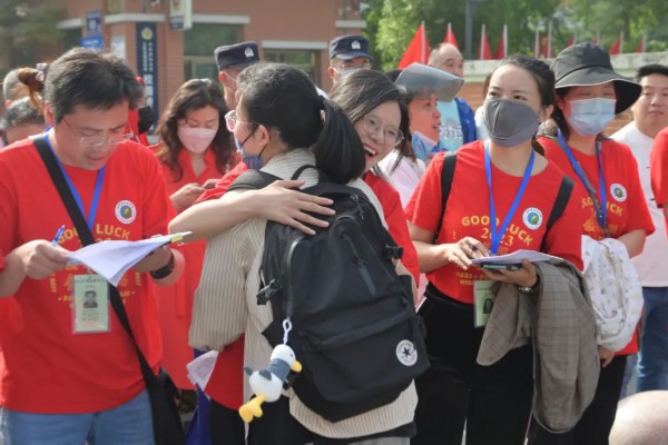 ▲江苏省淮阴中学考点门口,送考老师与考生击掌、拥抱,给予考生信心与力量