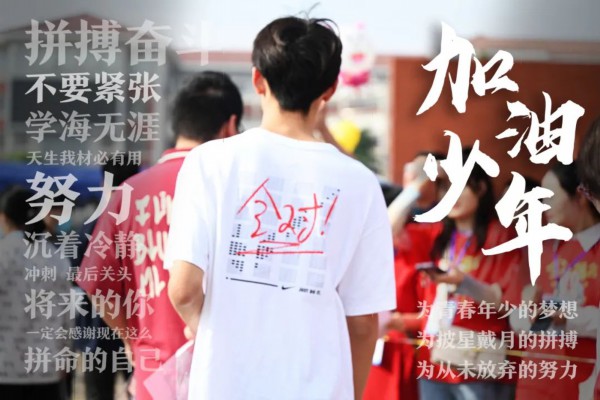 ▲江苏省清浦中学考点附近,送考老师为考生加油打气