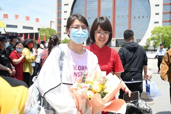 ▲江苏省清浦中学考点,走出考场的考生手捧鲜花,与家长合影