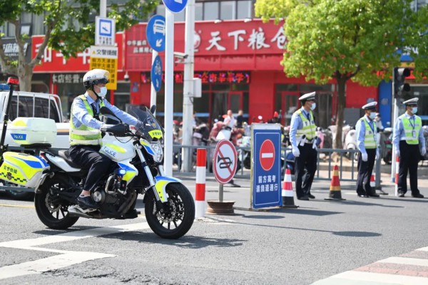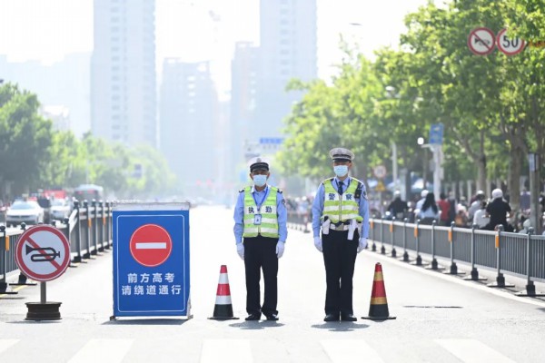 ▲解放东路路段,交警正在进行交通管控,为高考考生保驾护航