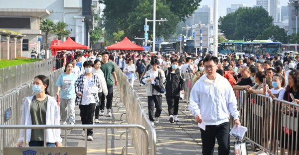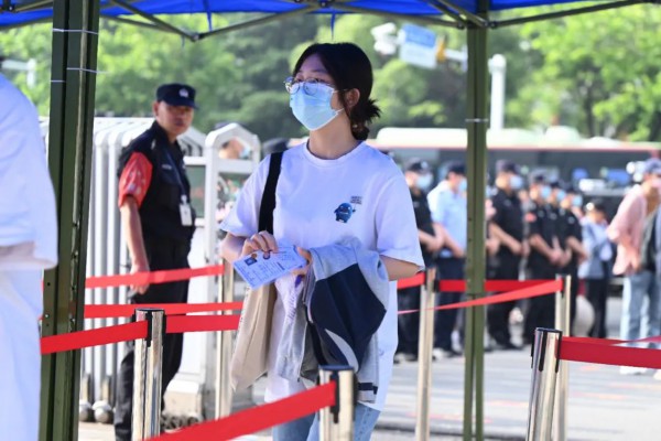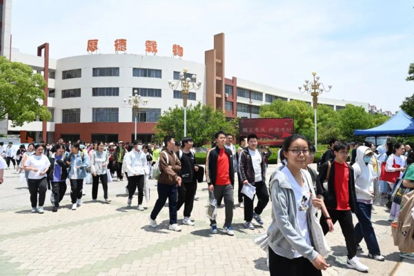 ▲江苏省淮阴中学考点,考生们告别家长、老师,陆续走入考场