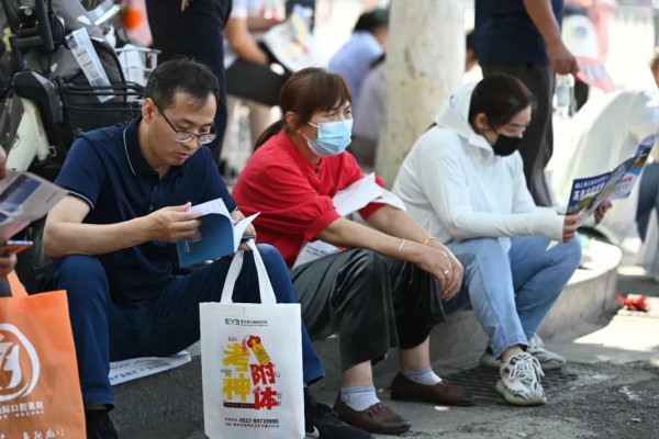▲江苏省清浦中学考点门口,家长们顶着炎炎烈日等待考试结束