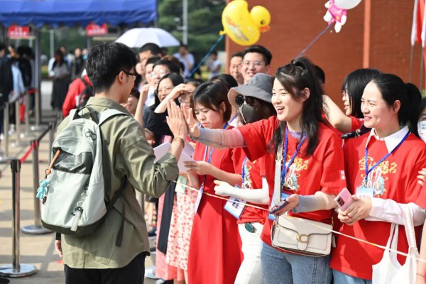 ▲江苏省清江中学考点附近,送考老师及家长与考生击掌、挥手等,为他加油助威