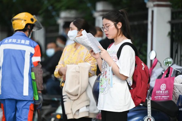 ▲江苏省清浦中学考点附近,送考的家长为考生检查准考证、身份证等相关证件以及考试用品是否带齐