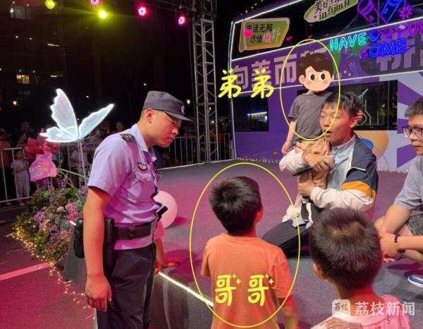 刚喊话没多久,男孩的家人便出现了。但谁知,出现的不是男孩的父母,而是男孩的哥哥——又一个与父母走散的孩子。民警看着这俩走失的亲兄弟哭笑不得。幸好小男孩的哥哥记得父母的电话,民警与其父母联系后,他们很快赶到了舞台处。在核实确认身份后,民警将两名孩子交还父母,并再三叮嘱其要吸取教训,在人流量大的地方务必要看管好孩子。