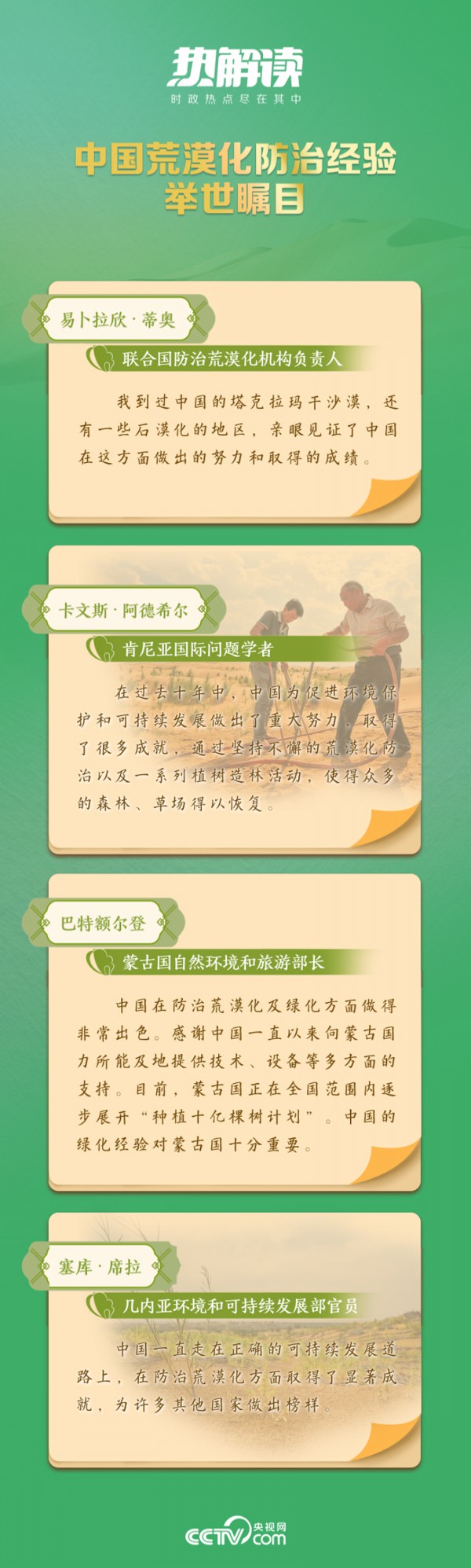 在6月6日召开的座谈会上,总书记讲到从“沙进人退”到“绿进沙退”的历史性转变,讲到荒漠化区域经济社会发展和生态面貌发生了翻天覆地的变化,讲到荒漠化和土地沙化实现“双缩减”,讲到防沙治沙法律法规体系日益健全……这些成绩,让14亿多中国人民都倍感荣光。