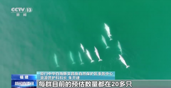 厦门中华白海豚文昌鱼自然保护区事务中心 资源管护科科长 朱开建:厦门市白海豚有两个种群,中华白海豚种群是东部种群和西部种群,每群目前的预估数量都在20多只。