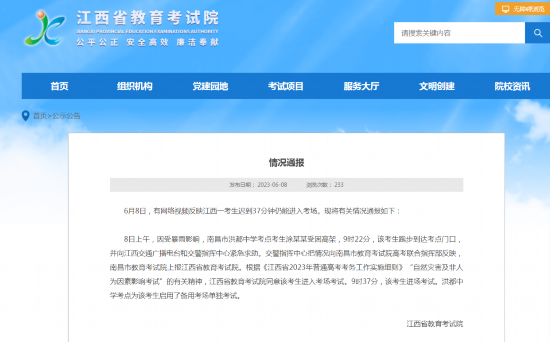 荔枝新闻讯 江西省教育考试院网站消息,6月8日,有网络视频反映江西一考生迟到37分钟仍能进入考场。现将有关情况通报如下:
