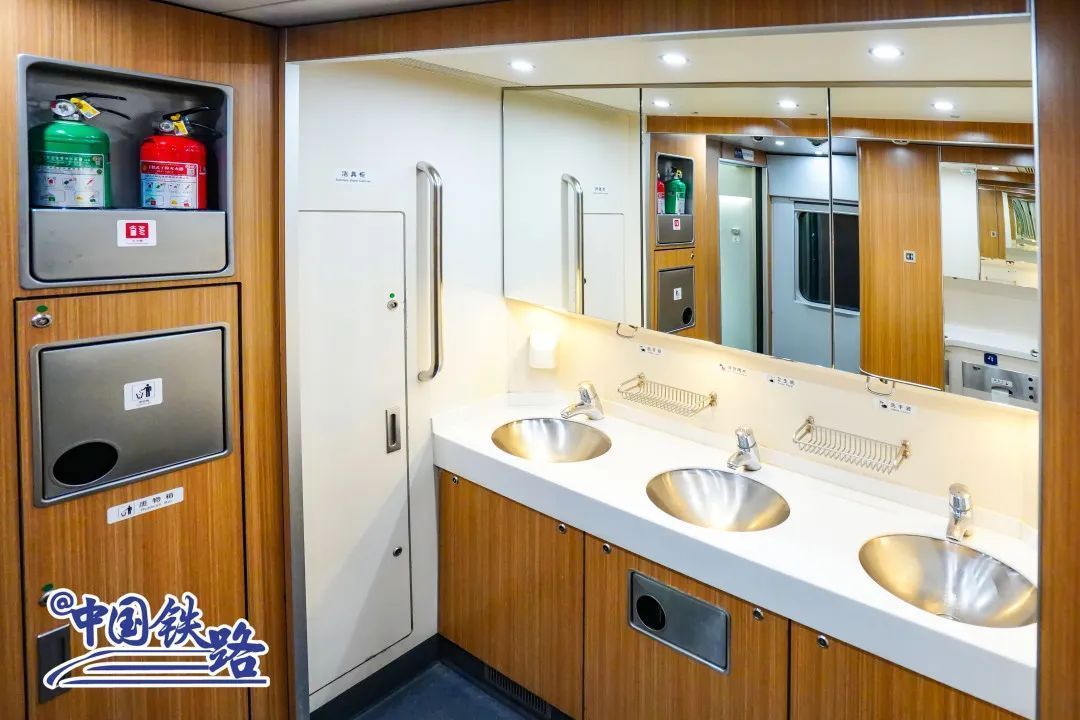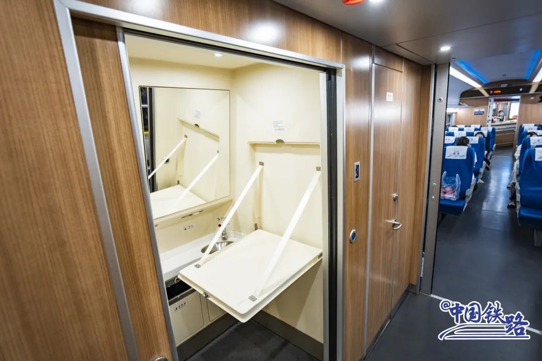 列车9号车厢设有餐吧,备有餐食饮品,方便旅客途中选购。多功能卫生间够大够宽敞,方便轮椅进出,同时设有婴儿护理台,为“宝妈”提供方便。