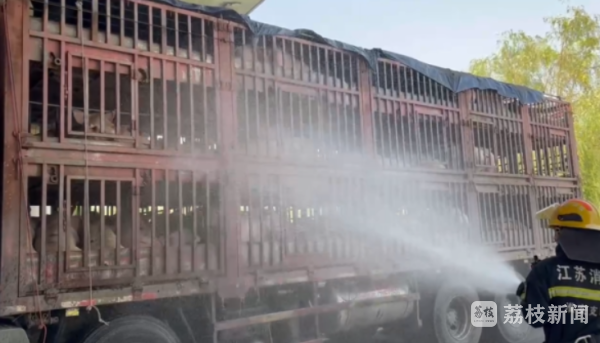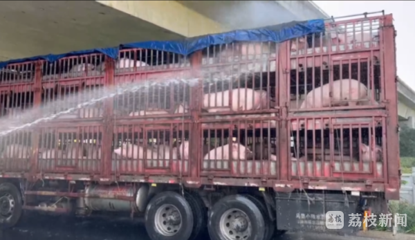 6月8日下午3点12分, 淮安市消防指挥中心接到报警求助称,位于洪泽区205由南向北方向临近洪泽湖大道处,一辆运载生猪的货车因天气炎热导致生猪中暑,希望得到消防帮助,为生猪降温。