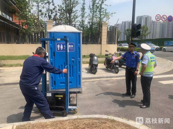 今年,南京市第一中学江北校区是当地新增考点,由于地处开发建设区域,南京江北新区综合行政执法总队联合顶山街道综合执法大队在做好服务保障的同时,也积极开动脑筋,调用移动公厕解决候考家长们的如厕难题。