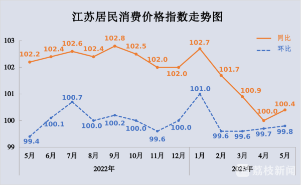5月份,江苏居民消费价格环比下降0.2%。其中,城市、农村均下降0.2%;食品价格下降1.2%,非食品价格持平;消费品价格下降0.3%,服务价格下降0.1%。
