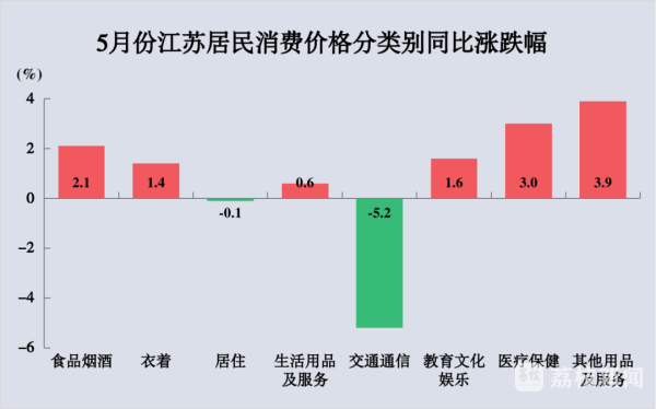 5月份,八大类商品及服务价格同比“六涨二降”。其中,食品烟酒价格上涨2.1%,衣着价格上涨1.4%,生活用品及服务价格上涨0.6%,教育文化娱乐价格上涨1.6%,医疗保健价格上涨3.0%,其他用品及服务价格上涨3.9%;居住价格下降0.1%,交通通信价格下降5.2%。