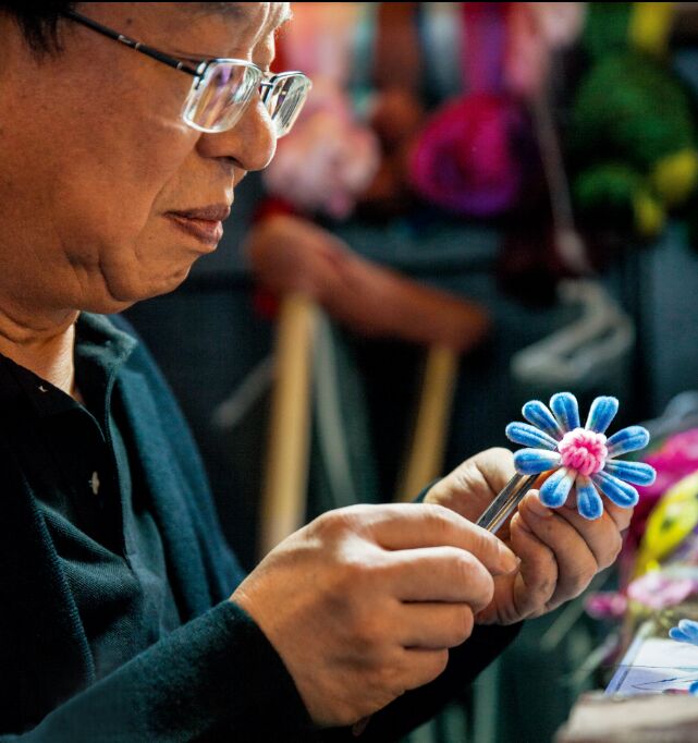 从设计、传播到与各行各业品牌联名,绒花传承者大胆“破圈”,推动非遗绒花技艺创新发展。《延禧攻略》等热播影视剧的发饰、奢侈品牌橱窗展陈、知名服装师设计的礼服等等,都融入了南京绒花元素,而这些都出自非遗传承人赵树宪的工坊。