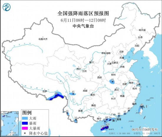 未来三天,华南、云南等地部分地区有中到大雨,局地有暴雨或大暴雨。预计,6月11日08时至12日08时,广西东南部沿海、广东南部沿海、海南岛、台湾岛、西藏东南部、川西高原南部、云南西南部、河南南部、湖北北部等地部分地区有大到暴雨,其中,海南岛北部等地局地有大暴雨(100~120毫米)。上述部分地区伴有短时强降水(最大小时降雨量20~40毫米,局地可超过60毫米),局地有雷暴大风或冰雹等强对流天气。中央气象台6月11日06时继续发布暴雨蓝色预警(见图1)。