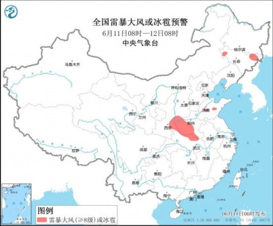 未来三天,内蒙古东部、东北地区、华北、黄淮、江淮、江南东北部等地有阵雨或雷阵雨,局地有短时强降水、雷暴大风或冰雹等强对流天气。预计6月11日08时至12日08时,吉林东部和西北部、陕西东南部、山西南部、山东中部、河南中西部和南部、湖北北部等地的部分地区将有8-10级雷暴大风或冰雹天气(见图2);内蒙古东部、吉林东部和西北部、辽宁东部和西南部、新疆北疆北部和伊犁河谷、陕西东南部、河北东北部、山东中南部、河南南部和西部、湖北北部和东部、福建东南部、云南西南部、广东西南部和东部沿海、海南岛东北部、台湾岛北部等地的部分地区将有短时强降水天气,小时雨量20-40毫米,局地可达60毫米以上。中央气象台6月11日06时发布强对流天气蓝色预警。