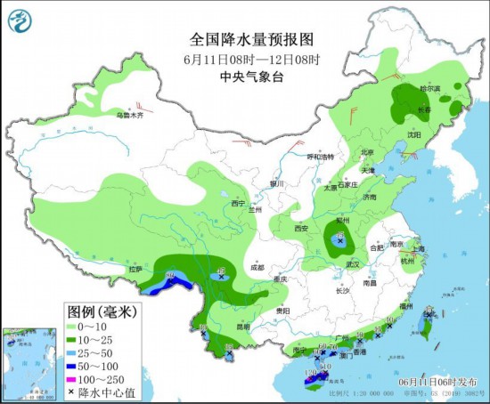 6月11日08时至12日08时,广西东南部沿海、广东南部沿海、海南岛、台湾岛、西藏东南部、川西高原南部、云南西南部、河南南部、湖北北部等地部分地区有大到暴雨,其中,海南岛北部等地局地有大暴雨(100~120毫米)。内蒙古、新疆北部、浙江北部等地部分地区有4~5级风(见图3)。