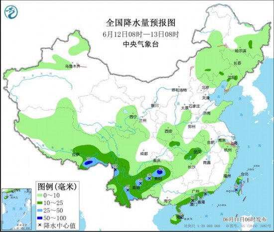 6月12日08时至13日08时,西藏东南部、西南地区东部和南部、台湾岛大部等地部分地区有中到大雨,其中,西藏东南部、贵州北部、云南西北部等地局地有暴雨(50~70毫米)。内蒙古中东部、辽东半岛、新疆北部、浙江北部等地部分地区有4~6级风(见图4)。