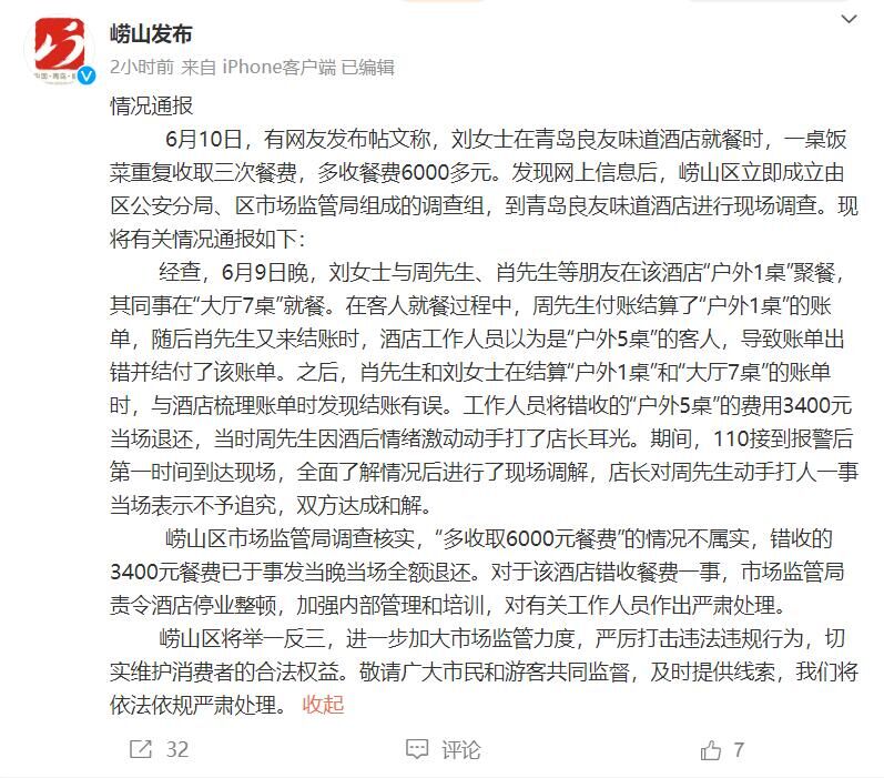 荔枝新闻讯 据@崂山发布今晚发布的最新消息,6月10日,有网友发布帖文称,刘女士在青岛良友味道酒店就餐时,一桌饭菜重复收取三次餐费,多收餐费6000多元。发现网上信息后,崂山区立即成立由区公安分局、区市场监管局组成的调查组,到青岛良友味道酒店进行现场调查。现将有关情况通报如下: