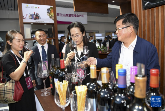 2022年9月7日,嘉宾在贺兰山葡萄酒展销会现场品鉴葡萄酒。新华社记者 冯开华 摄