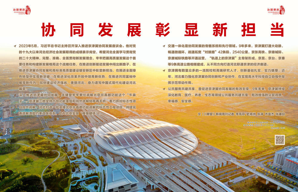 环绕京津的河北,找准在协同大局中的定位坐标,抢抓重大机遇,全面落实“三区一基地”(全国产业转型升级试验区、全国新型城镇化与城乡统筹示范区、京津冀生态环境支撑区、全国现代商贸物流重要基地)功能定位,立足自身比较优势打造一系列重点承接平台,努力打通重点区域连通京津经济廊道,在推进协同创新、产业协作中增强经济发展内生动力,持续深化公共服务共建共享造福百姓,不断推进协同发展向深度、广度拓展,努力推进中国式现代化在河北展现美好图景。