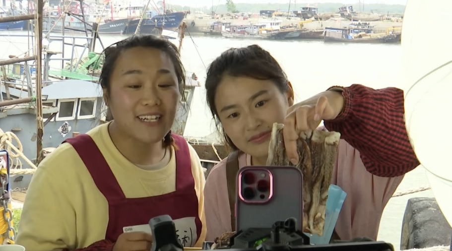 “各位哥哥姐姐们,今天咱直播间里福利大放送!尤其是现在的淡季,更是休渔期了,去菜市场里面买一条带中带尾的大鱿鱼,一条也得20块钱。咱们家是纯纯的鱿鱼须子,鱿鱼在海里面就是靠这个来扒拉扒拉水的么,相当有生命力!赶紧拍!”正在海头码头直播带货的是赣榆海头镇海脐村渔民匡立鹏的家人张丽。