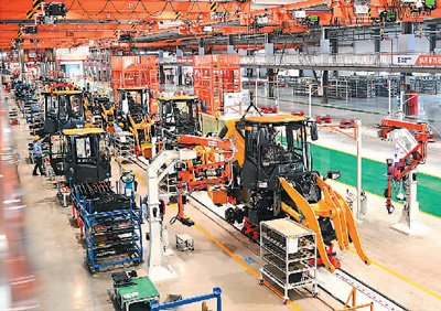 得益于RCEP协定生效,柳州工程机械海外订单量不断增多。图为6月2日,工人在广西壮族自治区柳州市柳工装载机灯塔工厂升级后的车间里赶制海外订单产品。
